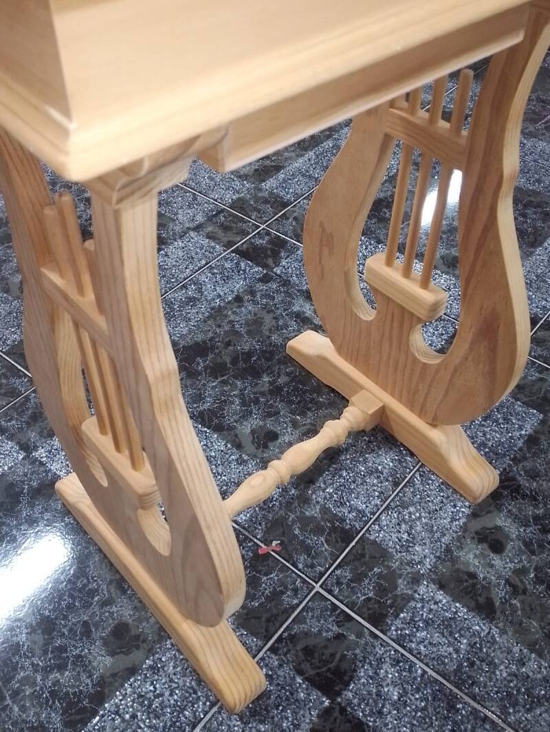 Está compuesta por zona organizadora, con tapa que se usa como mesa, cajón parte trasera y patas con forma de arpa.